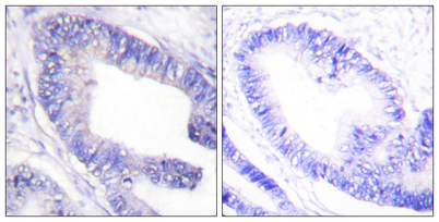 Immunohistochemistry analysis of paraffin-embedded human colon carcinoma, using IRS-1 (Phospho-Ser1101) Antibody. The picture on the right is blocked with the phospho peptide.