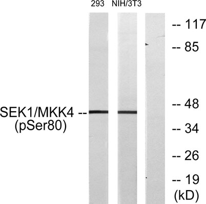 The antiserum was produced against synthesized peptide derived from human SEK1/MKK4 around the phosphorylation site of Ser80. AA range:46-95