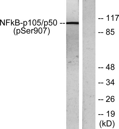 The antiserum was produced against synthesized peptide derived from human NF-kappaB p105/p50 around the phosphorylation site of Ser907. AA range:874-923