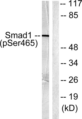 The antiserum was produced against synthesized peptide derived from human Smad1 around the phosphorylation site of Ser465. AA range:416-465