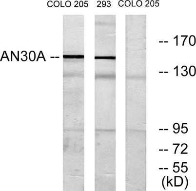 The antiserum was produced against synthesized peptide derived from human AN30A. AA range:1041-1090