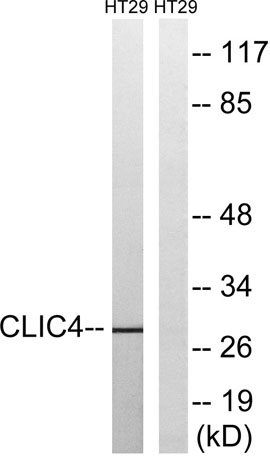 The antiserum was produced against synthesized peptide derived from human CLIC4. AA range:1-50