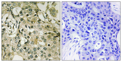 Immunohistochemistry analysis of paraffin-embedded human breast carcinoma tissue, using DTYMK Antibody. The picture on the right is blocked with the synthesized peptide.