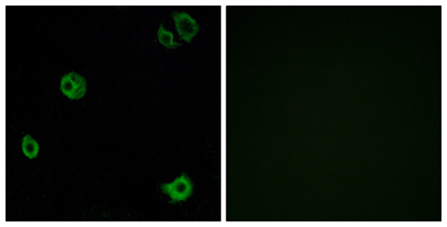 Immunofluorescence analysis of A549 cells, using GPR110 Antibody. The picture on the right is blocked with the synthesized peptide.