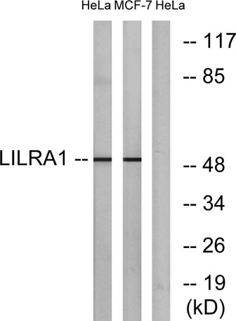 The antiserum was produced against synthesized peptide derived from human LILRA1. AA range:53-102