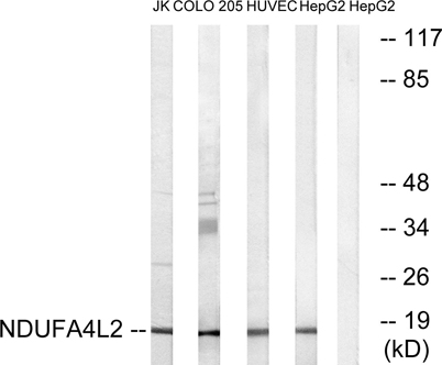 Western blot analysis of lysates from HepG2, HUVEC, COLO, and Jurkat cells, using NDUFA4L2 Antibody. The lane on the right is blocked with the synthesized peptide.