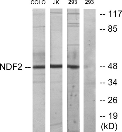 The antiserum was produced against synthesized peptide derived from human NDF2. AA range:61-110