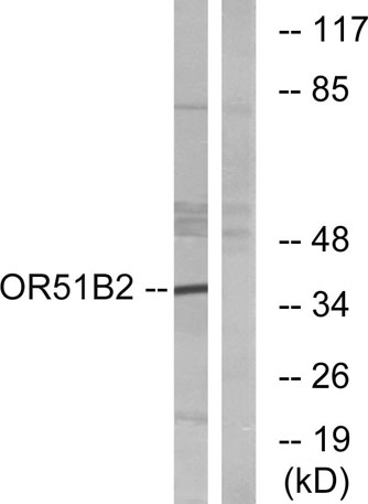 The antiserum was produced against synthesized peptide derived from human OR51B2. AA range:196-245