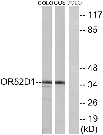 The antiserum was produced against synthesized peptide derived from human OR52D1. AA range:269-318