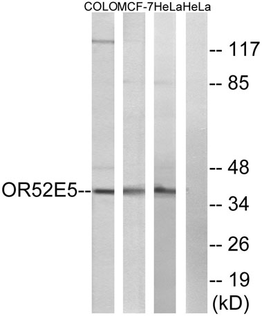Immunogen: The antiserum was produced against synthesized peptide derived from human OR52E5. AA range:199-248