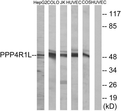 Western blot analysis of lysates from COLO, HUVEC, HepG2, Jurkat, and COS cells, using PPP4R1L Antibody. The lane on the right is blocked with the synthesized peptide.