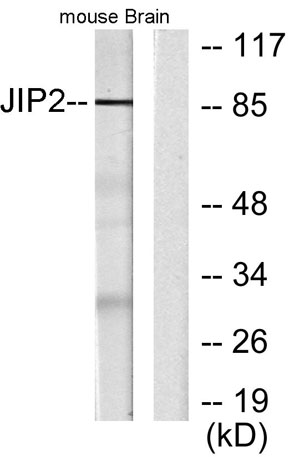 The antiserum was produced against synthesized peptide derived from human JIP2. AA range:581-630