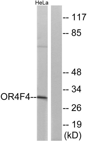 The antiserum was produced against synthesized peptide derived from human OR4F4. AA range:256-305