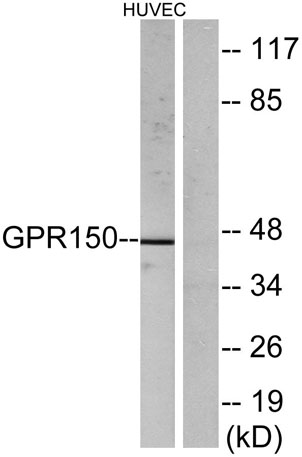 Western blot analysis of lysates from HUVEC cells, using GPR150 Antibody. The lane on the right is blocked with the synthesized peptide.